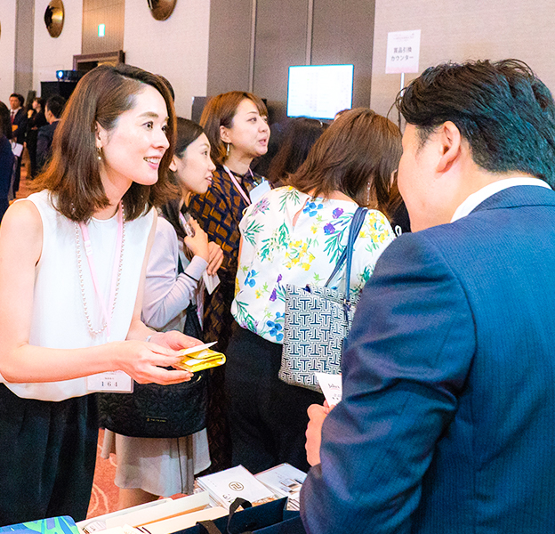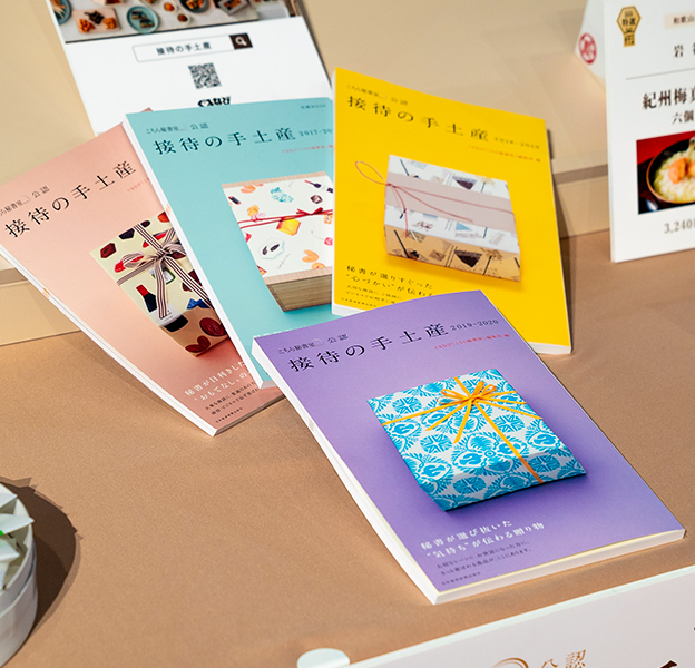 懇親会終了後にはお土産もご用意。ご参加いただいた方全員に「接待の手土産セレクション 2019-2020」のムック本、掲載商品などをお持ち帰りいただきました。また、店舗サービスや商品詳細などを関係者と直接お話しすることができる交流カウンターは、貴重な情報収集の場となっていました。
