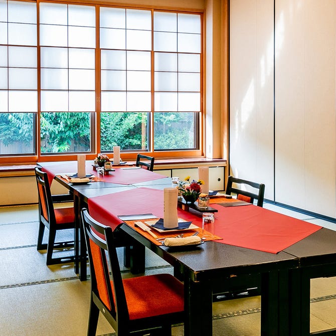当店は全館畳敷きのバリアフリー構造で、車いすのままご利用いただけるユニバーサルトイレを完備しております。また、特別にあつらえた座りやすい高さのテーブル席もございますので、ご年配のご親族がいらっしゃる法事や長寿をお祝いする会など、ご移動やお食事時のお足を気にせずゆったりとおくつろぎいただけます。