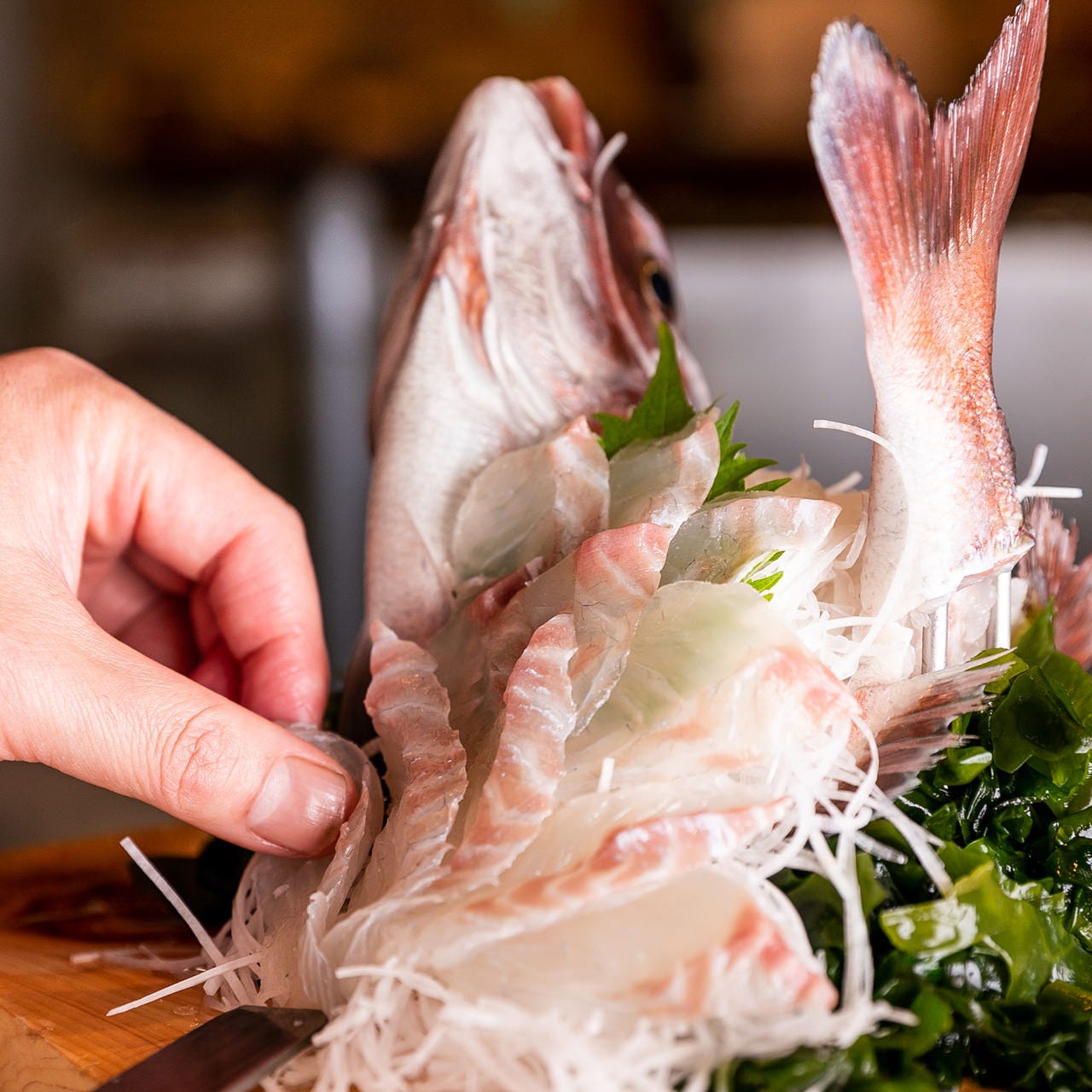 いけすを泳ぐ活鯛の豪華舟盛りと地産地消の逸品『活魚会席』 お祝いに最適です