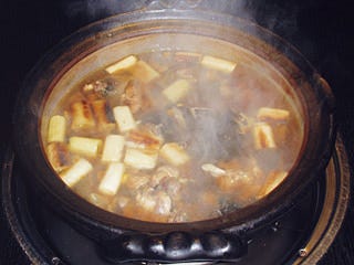 丁寧にアクをとりながら3時間煮込んだスープを飲みながら身を食べ、最後は雑炊をいただきます。