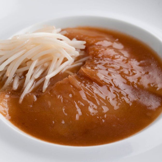 炊きたてのご飯と一緒にお楽しみいただくWakiyaの看板メニュー【極上フカヒレの上海風煮込み】。Wakiyaにお越しいただいたら必ず召し上がっていただきたい自慢の一皿です。