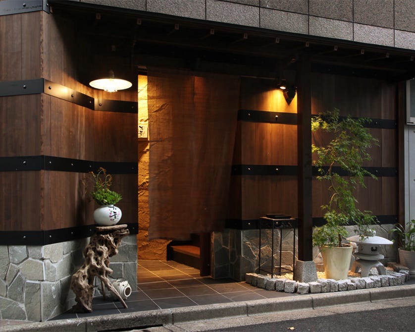 路地裏にひっそりと佇む門構え。扉を開けると海底に居るような空間に導かれ、階段を上がれば欅の本柱に目を惹かれます。
