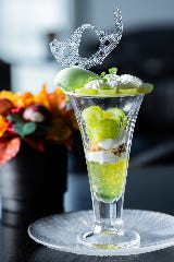 …食感のいいパータフィロを使用したタルトの器に和栗のパルフェ、洋梨のコンポートと旬のフルーツを盛り付け、紅葉の葉のチュイルを散らした収穫祭をイメージした一皿。秋の味覚を贅沢に詰め込みました。