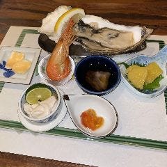 - ・貝牡蠣(厚岸産)国産レモン添・イバラ蟹外子醤油漬け・厚田産数の子・タラバ蟹の内子ソテーとゆり根合え・北海道産アスパラガス岩塩添え・北海道産活ナマコのポン酢・北海道産北海シマエビ