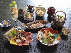 季節のお料理5品とご飯・赤出汁・香の物、パフェ・黒糖わらび餅となります。