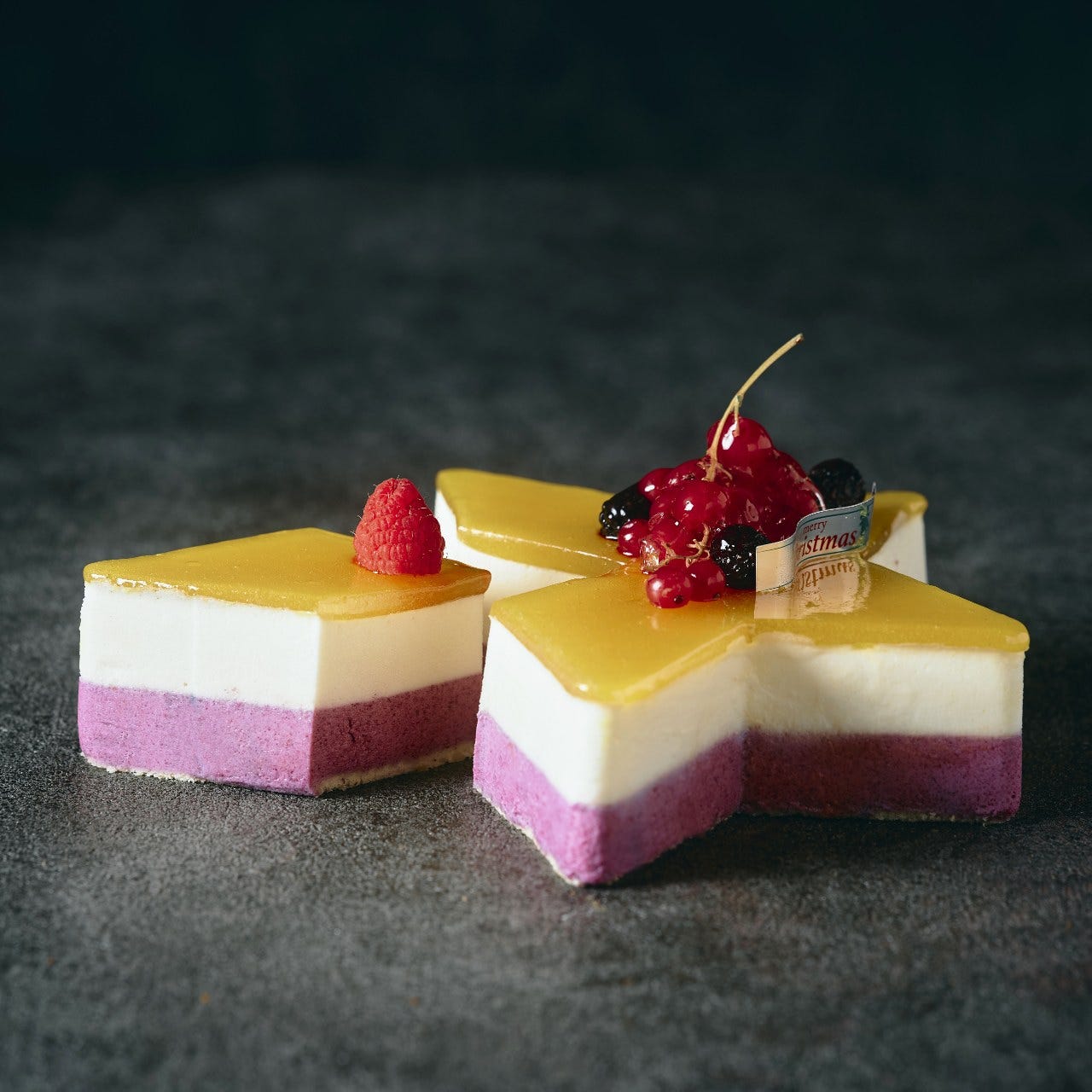 さわやかな風味のブルーベリームースと2種のクリームチーズをブレンドさせたレアチーズのケーキ。