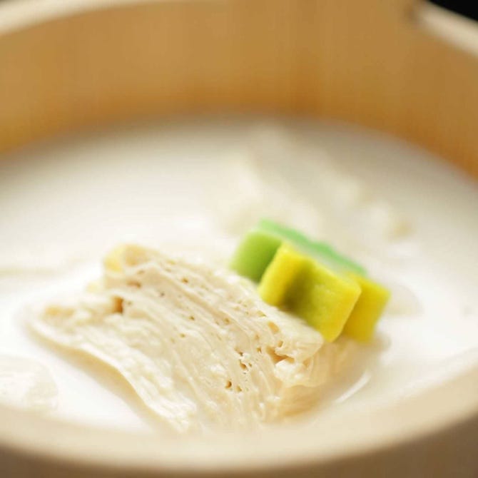 自社の「ゆば工房」でその日に作った出来たての湯葉を皆様にご提供いたしております。滋賀県産の厳選されたオオツル大豆と新鮮な水で作った美味しい豆乳から掬い上げます。当店名物「ゆば桶」は、京の名産 北山杉で作られた手桶にたっぷり入れて召し上がっていただく美味なる逸品。上品な京の味を存分にお楽しみください。