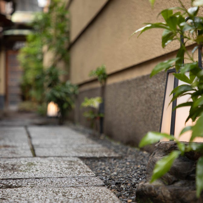 打ち水が涼しげな石畳に面した椅子カウンター席では、京都祇園の豊かな食材を目の前に揚げたての板前天ぷらをお気軽にお楽しみいただけます。