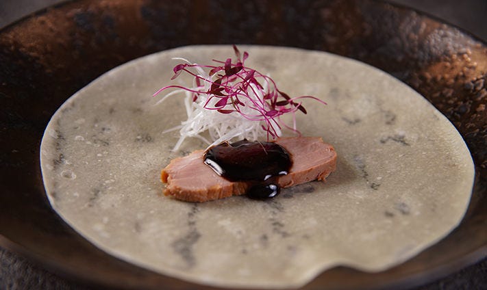 ■鴨のクレープ包み ~燦宮秘伝の黒酢とプラムのソース~