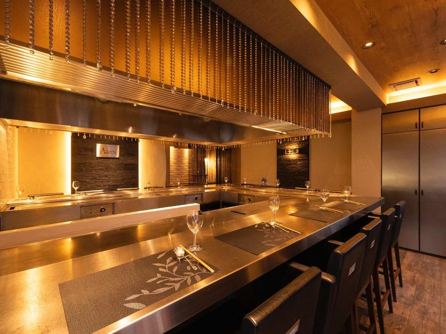 コの字型の鉄板をさらにぐるりと取り囲むコの字型のカウンターテーブルです。ソファー感のある椅子は、グループごとに席間のゆとりをもって配置いたします。目の前で調理するシェフとの会話や、高級素材を贅沢に焼き上げる臨場感あるパフォーマンスを楽しんでください。8名様~12名様まで店内貸切でのご利用も可能です。