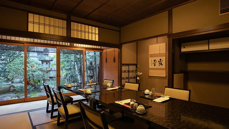 七代目小川治兵衛作「植治」の奥庭を眺めながら、贅を極めたひとときをお過ごしいただけるお座敷席。特別なゲストを迎えるシーンにも相応しい情趣と風格に満ちた当店自慢の空間です。襖を開けると、1つの大広間に早変わり。開放感が溢れる、広々とした場所でのお食事が叶います。