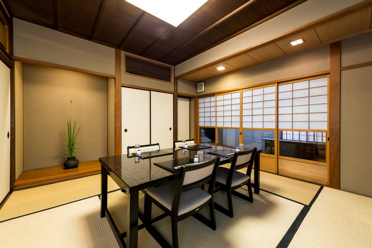 七代目小川治兵衛「植治」作庭を眺めながらの優雅な会食を愉しんで頂けます。ふすまを広げれば広間にして多数での宴会にご利用いただけます。