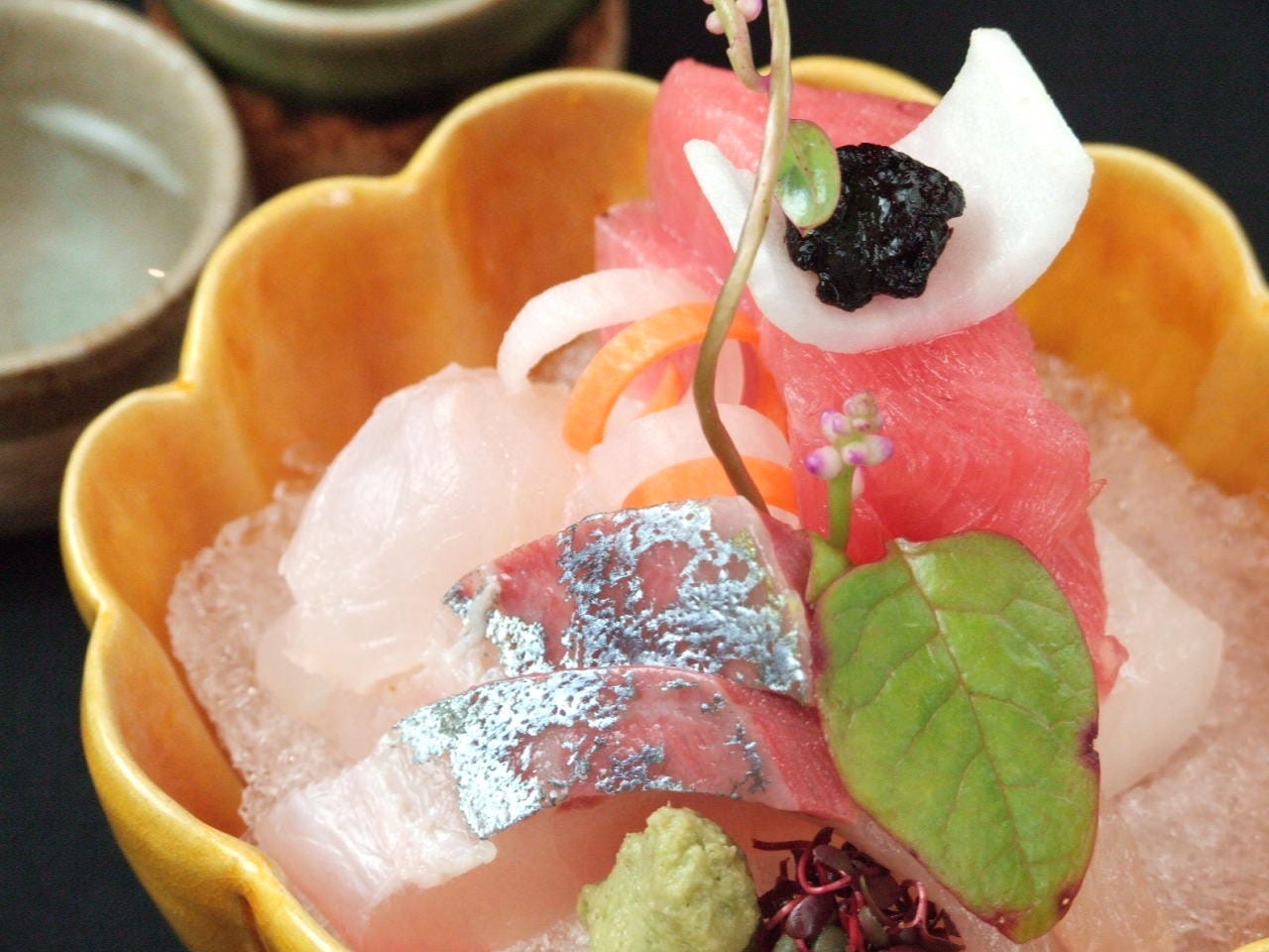 【八 寸】 白魚黄身酢がけ・鯛昆布〆叩き蕨掛け
