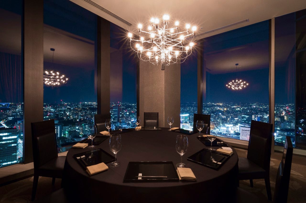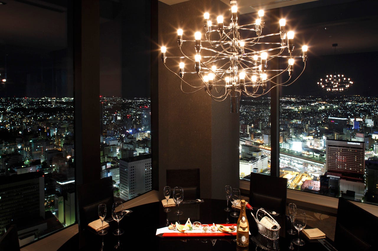 北側と(泉方面)東側に(仙台駅側)大きな2面の窓、円卓のある特別個室になります。ランチタイムには天候にもよりますが仙台湾の行き交う船舶までご覧いただけます。ディナータイムには仙台で一番高いところからの夜景をお楽しみいただけます。4名様から8名様でご利用いただけ、お部屋代11,000円頂戴しております。