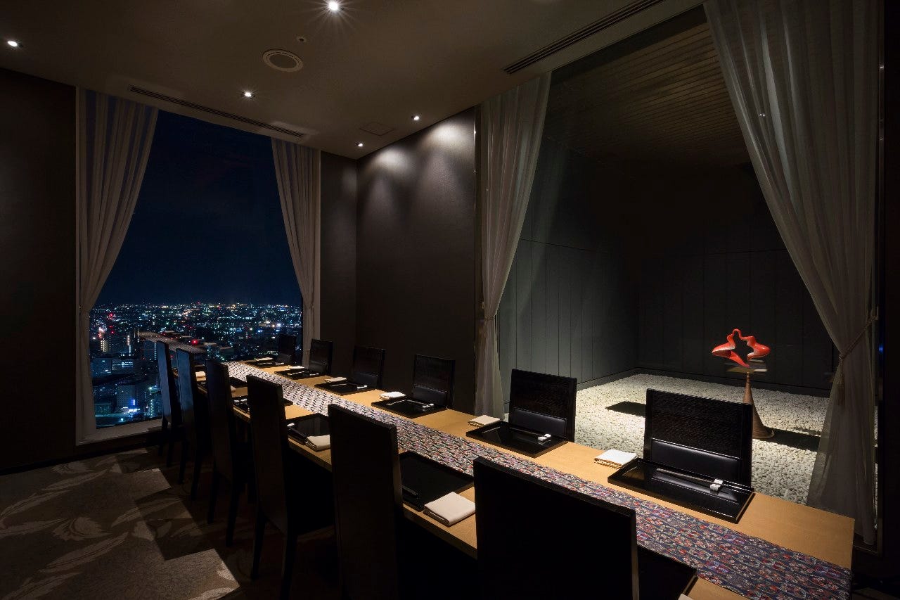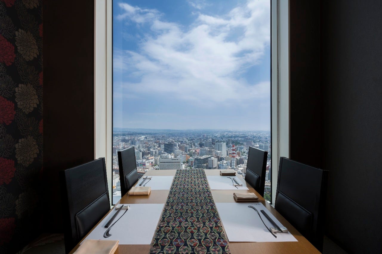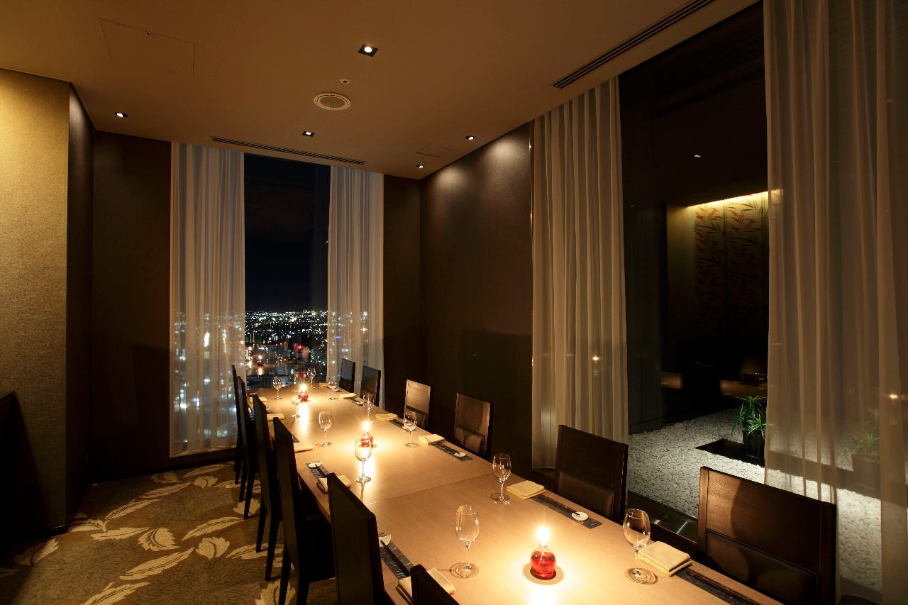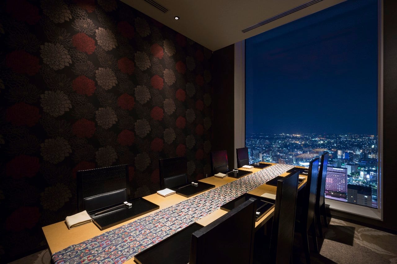 東側に大きな窓のある完全個室になります。仙台駅側の風景を一望でき、ランチタイムには天候にもよりますが、仙台湾の行き交う船舶もご覧いただけます。ディナータイムには仙台で一番高い所からの夜景をお楽しみいただけます。接待やお顔合わせ等の食事会に最適な個室になります。お部屋代5,500円頂戴しております。