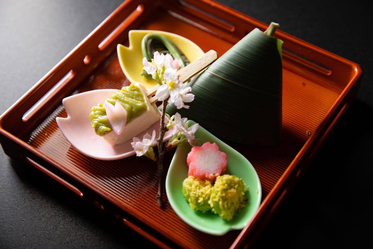 花見八寸 鱒柚庵桜香焼き 海老木の芽寿司
